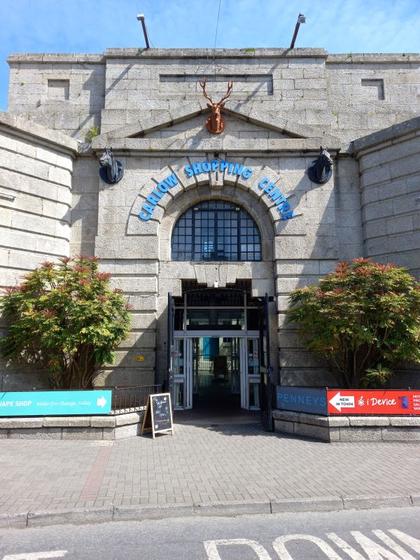 Castle Street with a view of Carlow Castle in the distanceCarlow Gaol on Kennedy Avenue is where our tour begins. It was in operation as a gaol from 1800 to 1897 and was then used by Thompsons for their engineering business for most of the 20th century. Now it’s Carlow Shopping Centre.