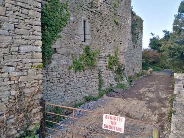 When you’re standing on the road facing the castle, walk towards the driveway on the right. You’ll see a gate with a sign that says “Strictly No Shooting”. Just before the gate on the left there’s a way to partly climb up into the castle.