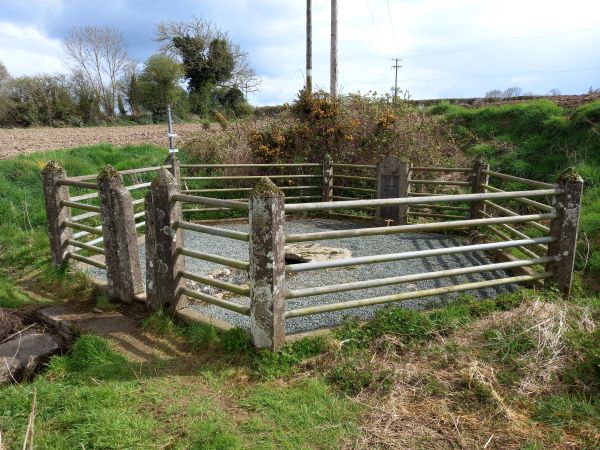 Take the lane beside the graveyard. When you come to a stone that says Julia Deering’s Field, cross the soccer pitch car park and step through the gap into the next field. Then start walking towards 10 o’clock until you come to the well which is in a dip in the field.